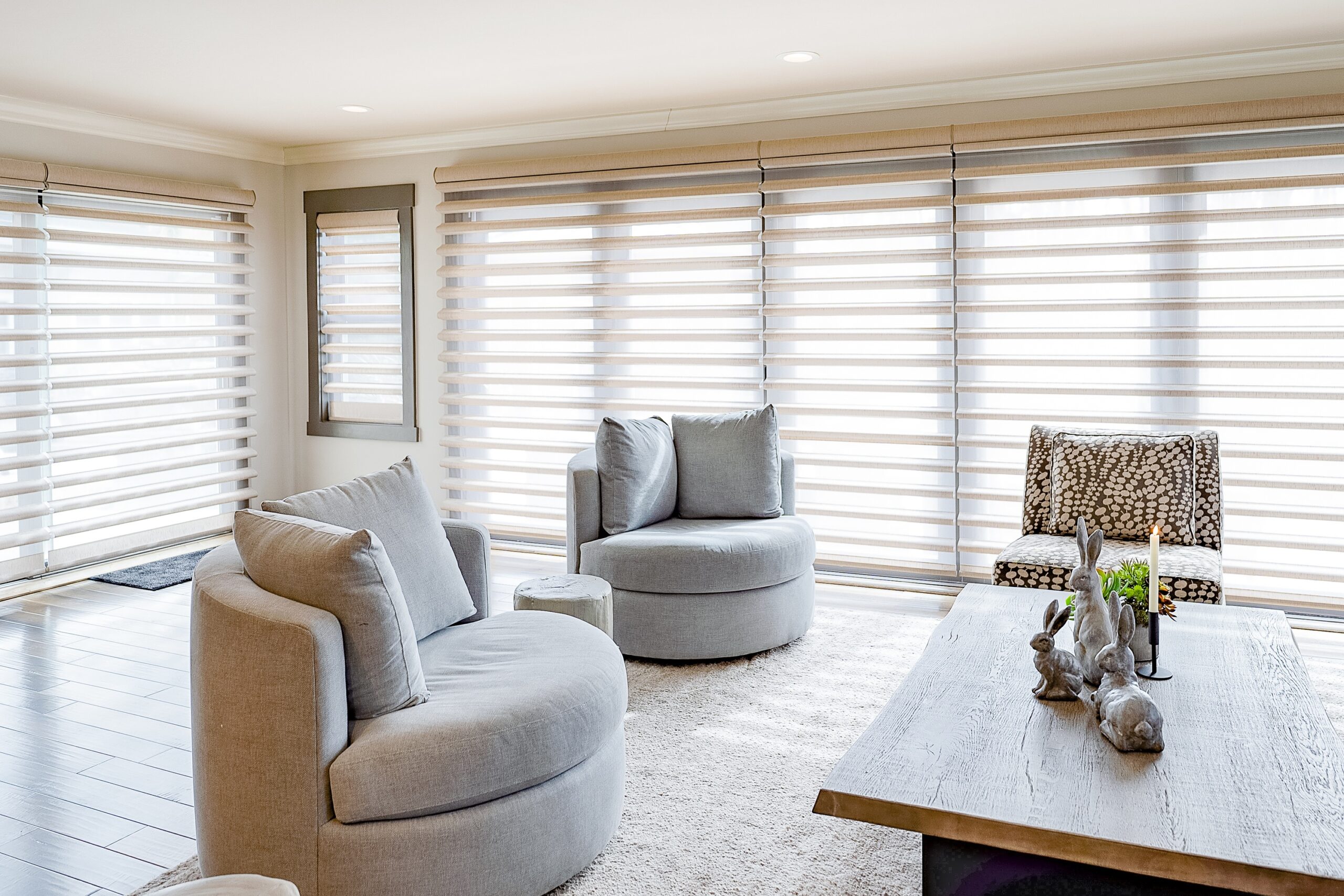 • View Larger Image Sun is diffused by side-by-side Pirouette sheer shades in an open living room with grey trim windows