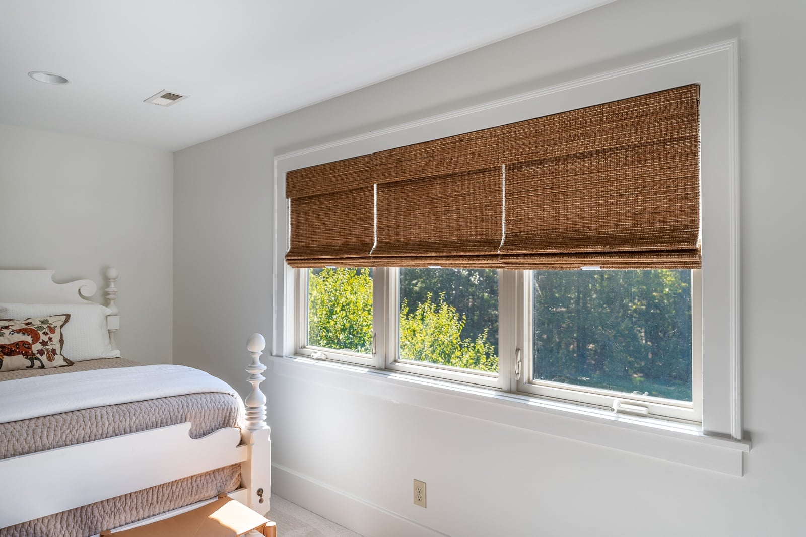 • View Larger Image Stacking brown woven wood shades with cordless feature in a bedroom window
