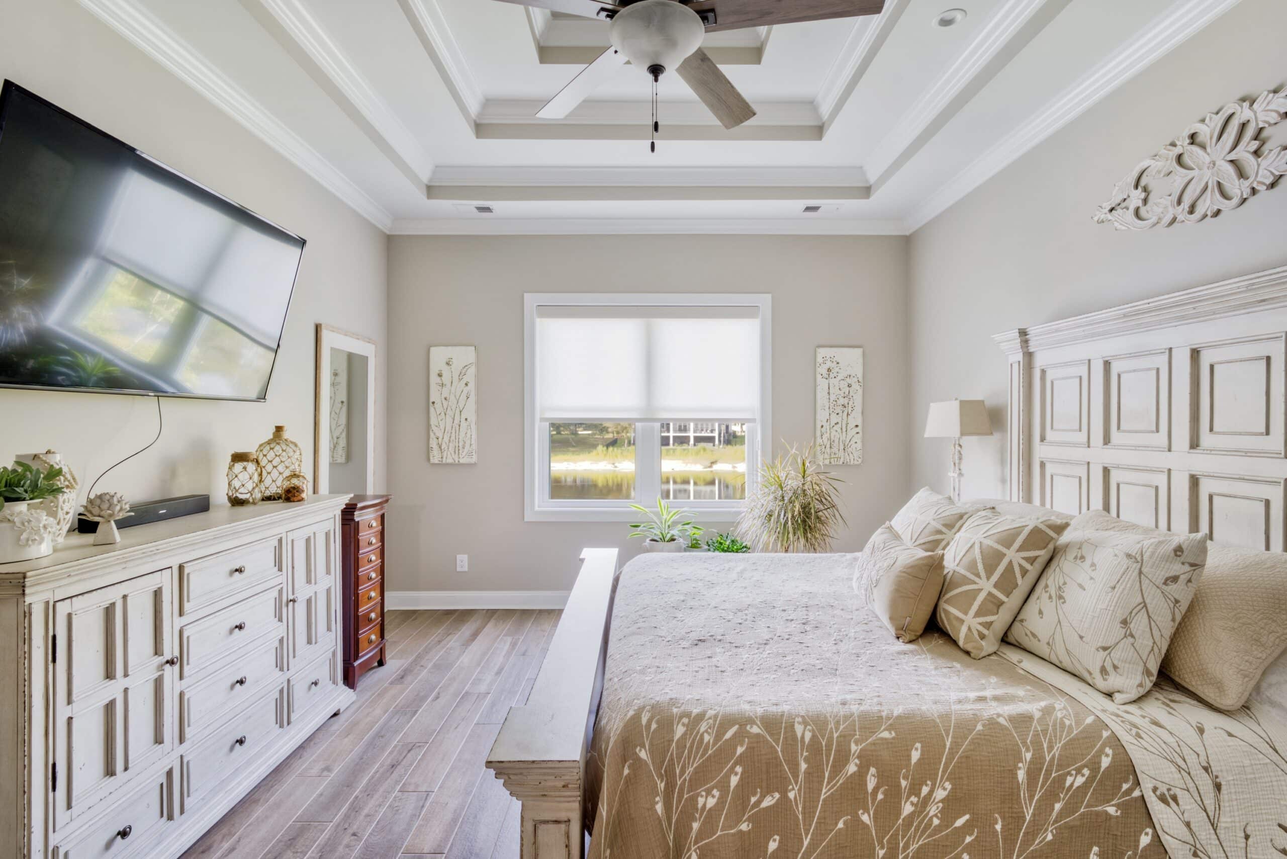 • View Larger Image Bedroom featuring a coffered ceiling, mounted TV, rustic wooden furniture, and decor with botanical and nautical motifs, overlooking a scenic view.
