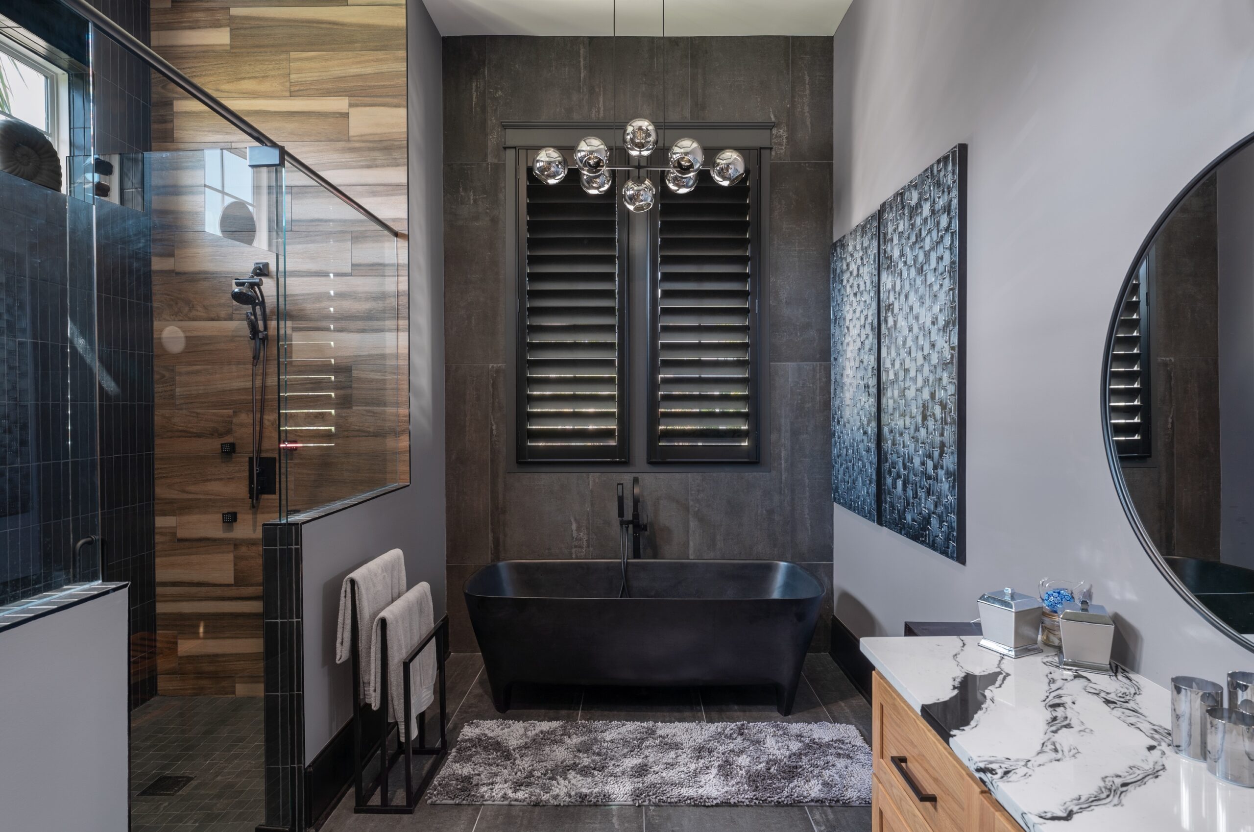 • View Larger Image Black hidden tilt plantation shutters over a free standing tub in a modern dark colored bathroom