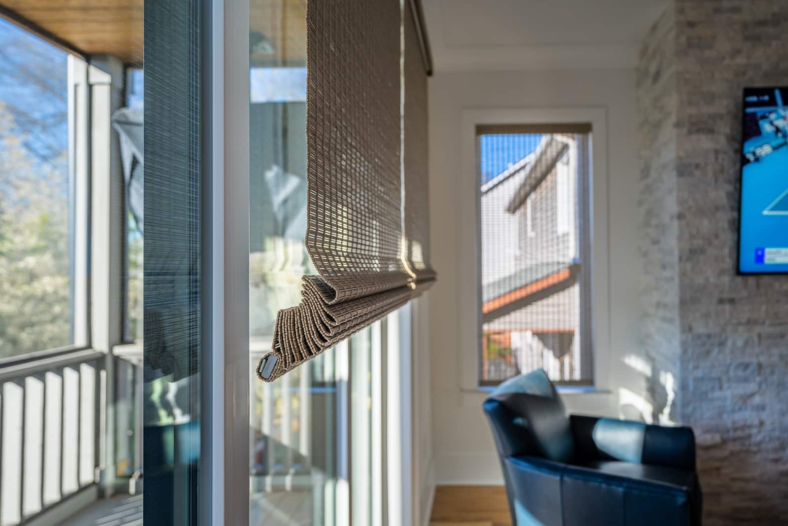 • View Larger Image Hunter Douglas Mindanao Maragusan fabric Light filtering woven wood shade in  on a sliding glass door in a living room