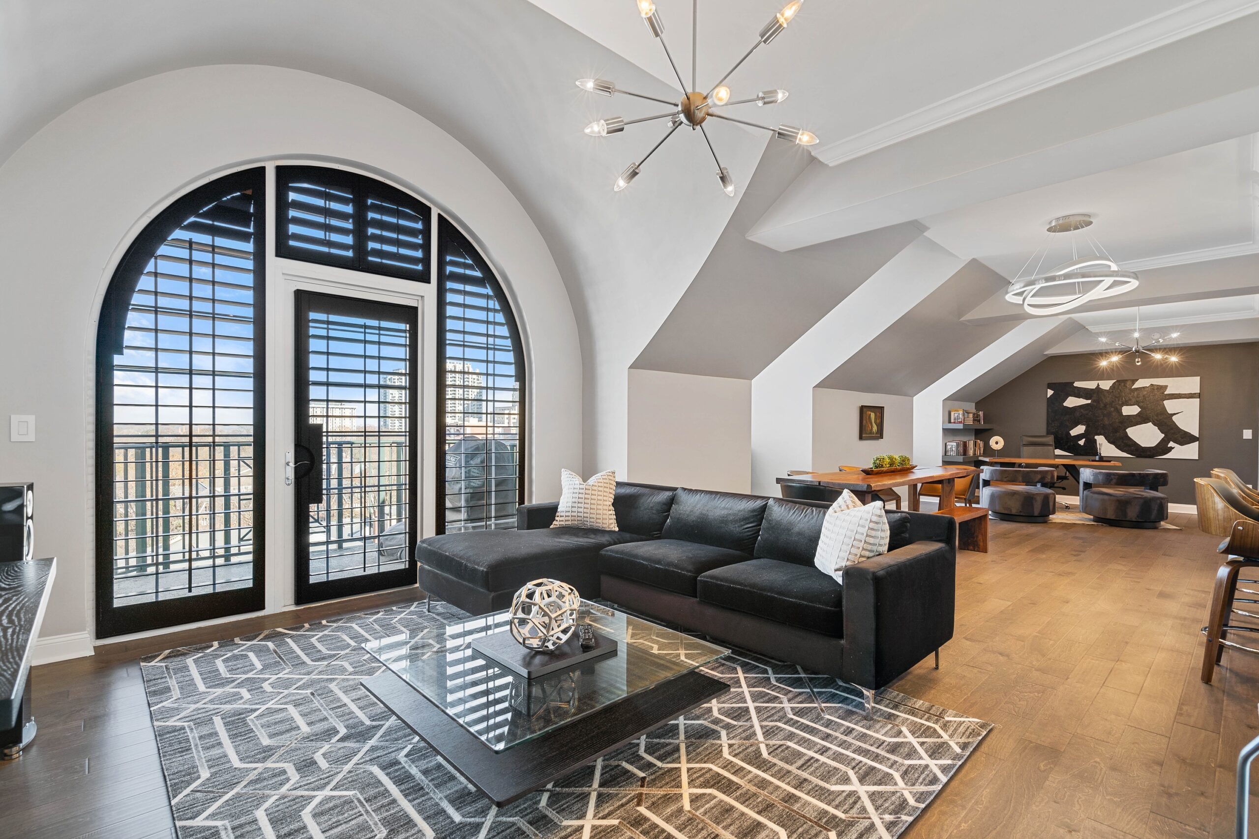 • View Larger Image A modern condo features a large arched window and door, both framed by custom black wooden shutters for a striking contrast