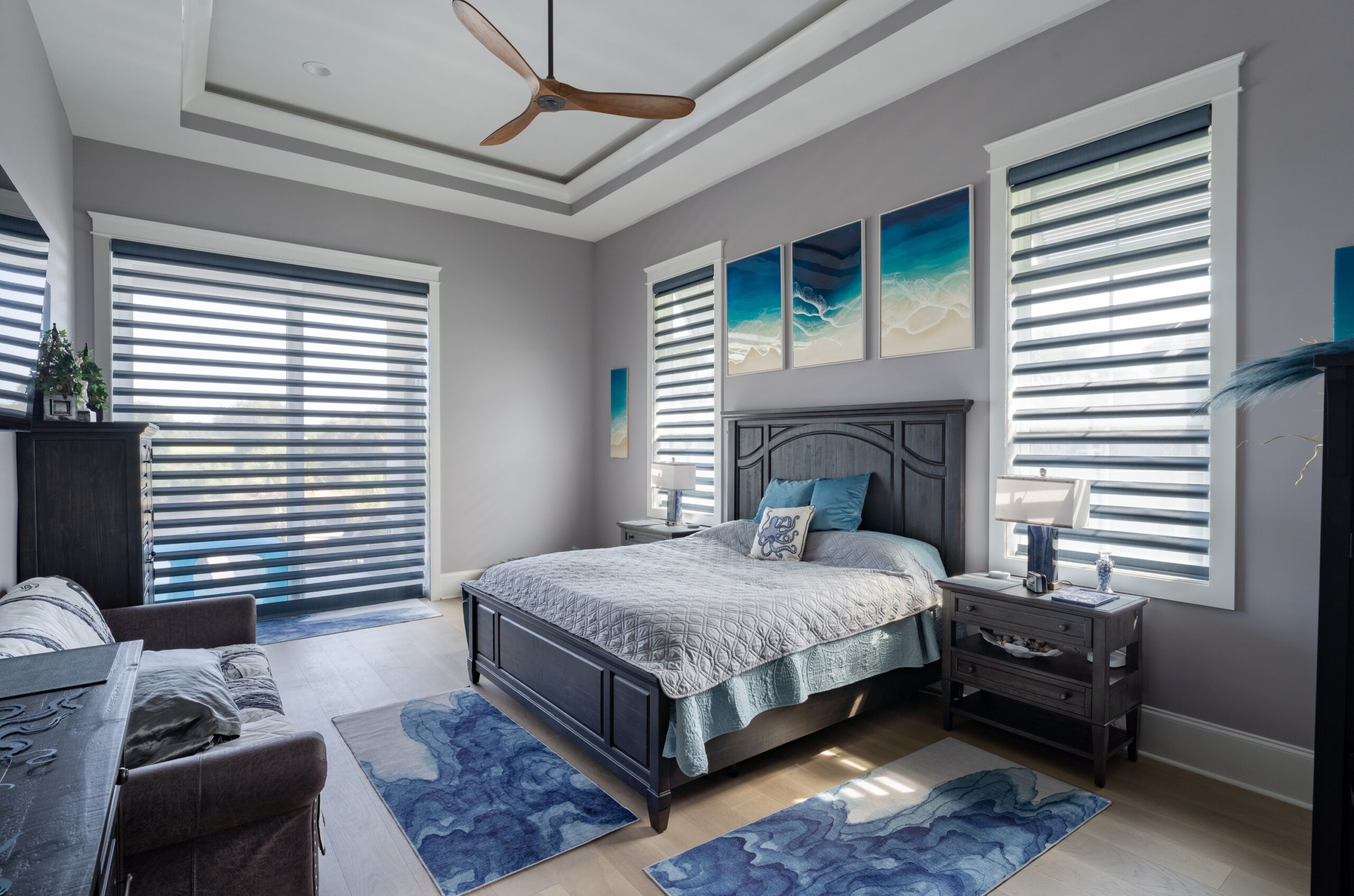 • View Larger Image Dark blue sheer shadings in a modern bedroom with a blue accents, grey walls and a coffered ceiling