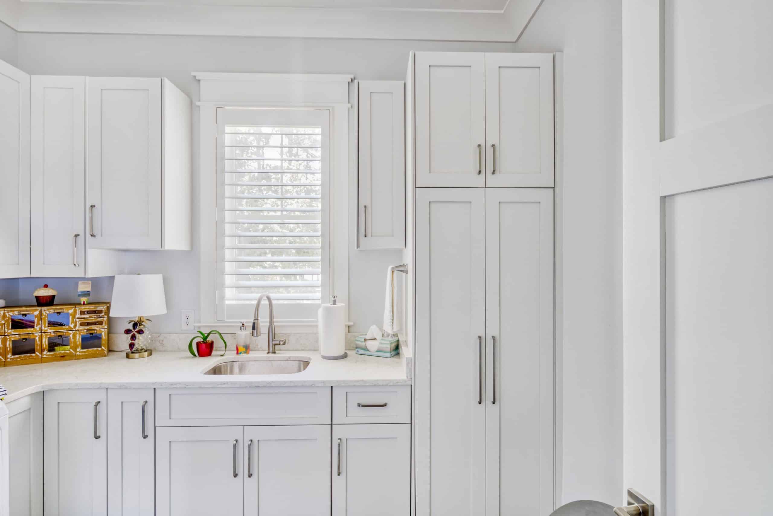 • View Larger Image A traditional kitchen with white cabinets and a hidden tilt plantation shutter above the sink