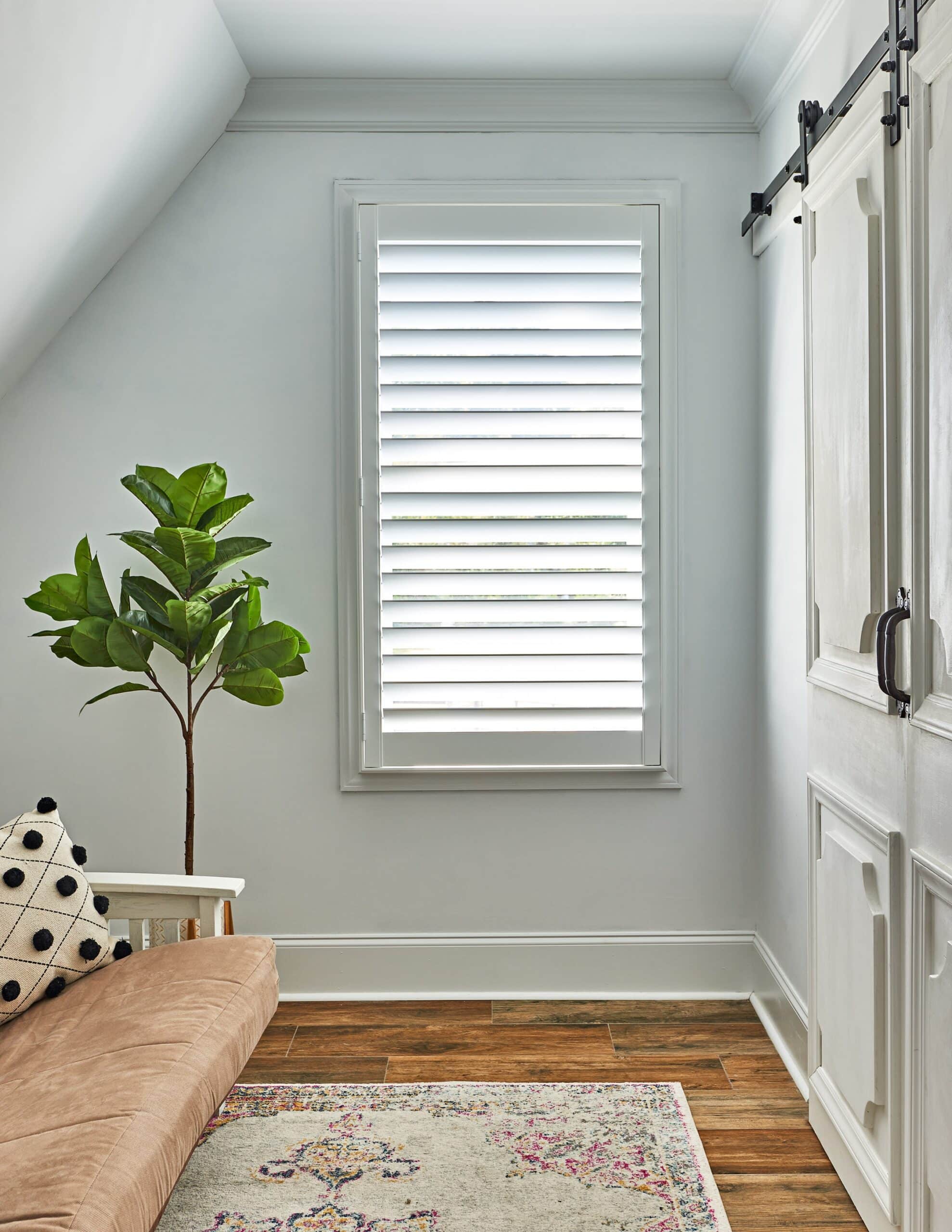 • View Larger Image Single wood shutter next to a sliding barn door in a bedroom