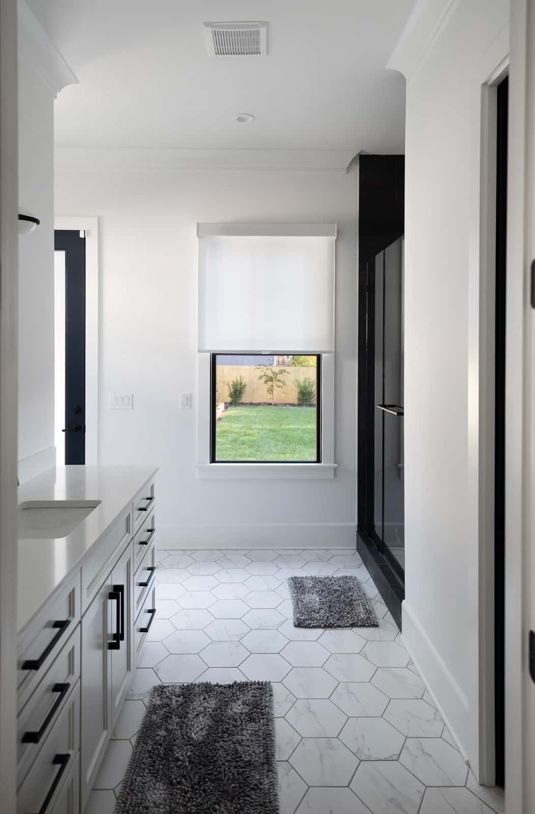 • View Larger Image Modern bathroom with white walls, a white roller window shade, hexagonal tiled floor, and a view of a backyard through the window.