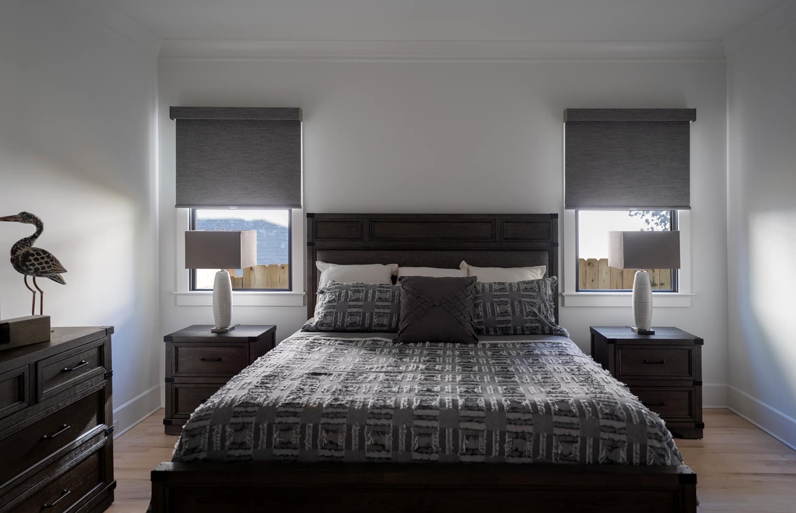 • View Larger Image Grey roller shade on windows on either side of a bed in a modern bedroom