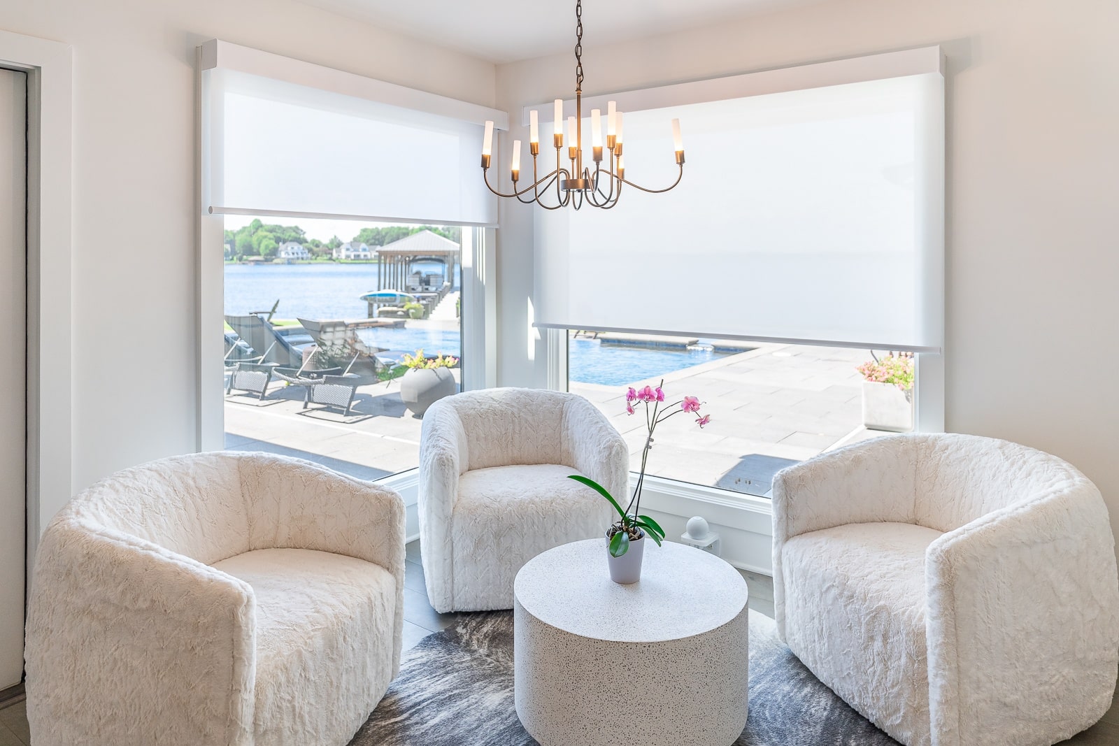 • View Larger Image Sitting room in a lakefront home with poolside seating and white motorized shades.