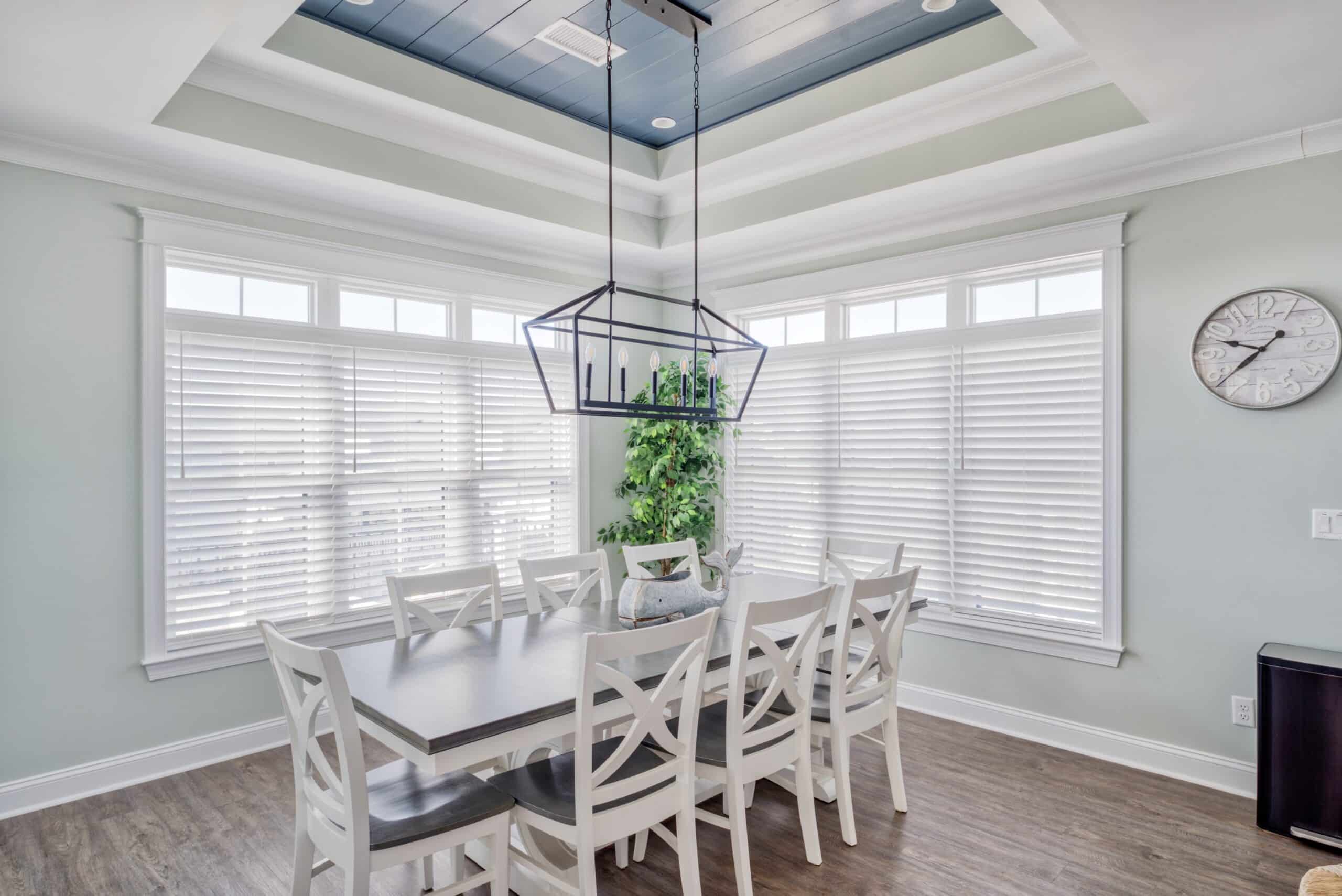 • View Larger Image Light, airy kitchen with large dining table and white faux wood blinds