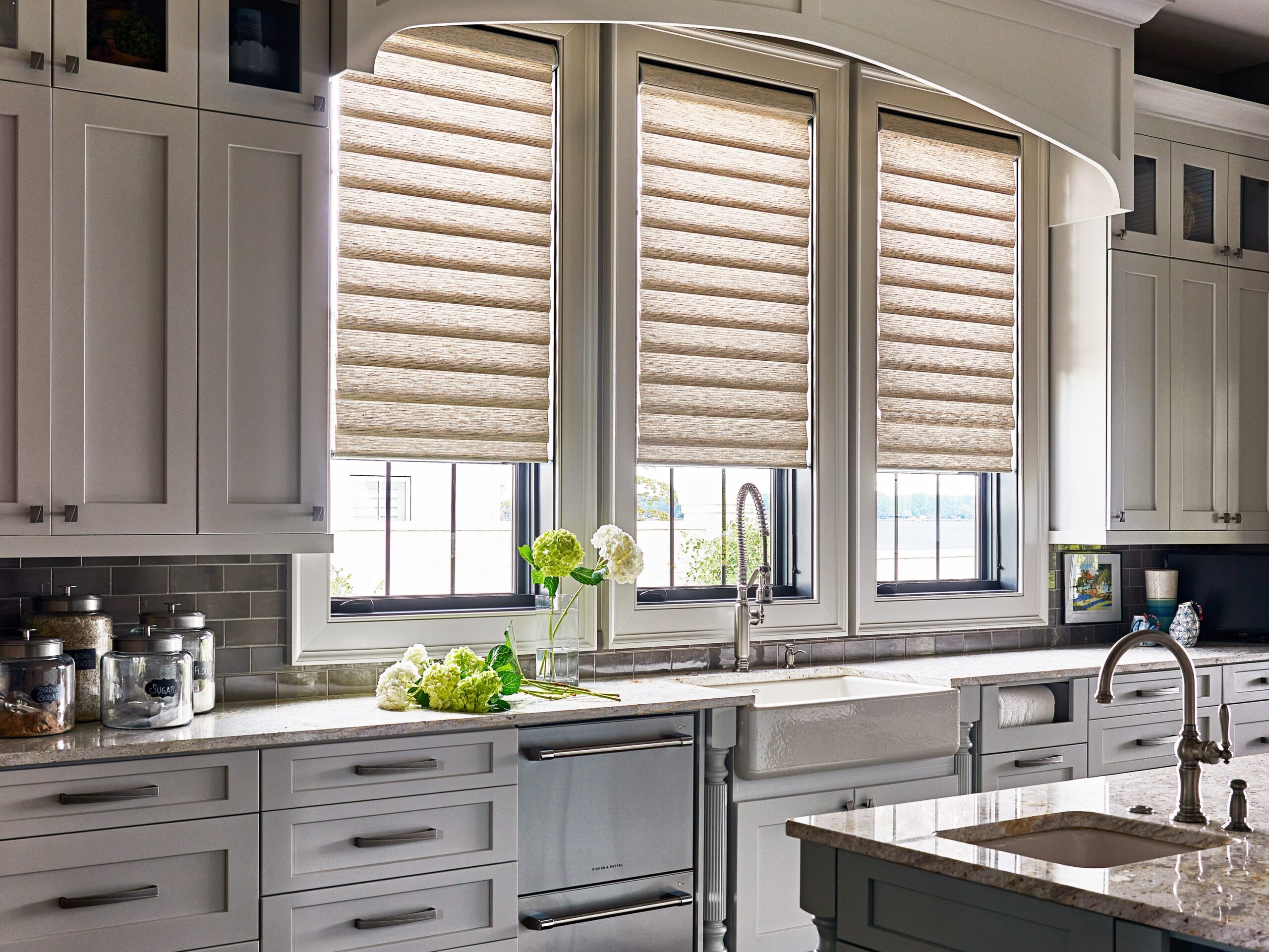 • View Larger Image Elegant kitchen with textured roman shades, white cabinets, and a bouquet of hydrangeas on the countertop