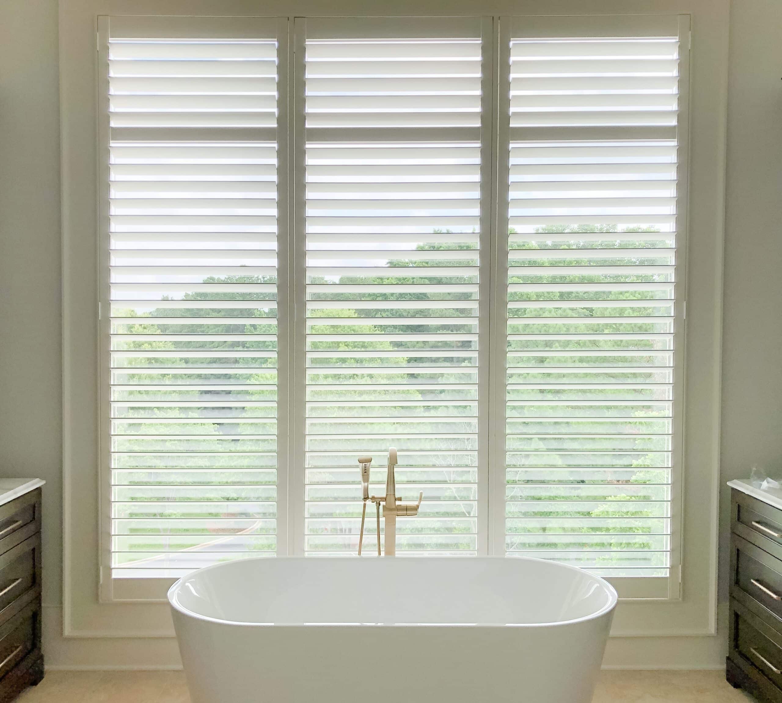 • View Larger Image A white floating tub with brass faucet below three tall white shutters with a divider rail