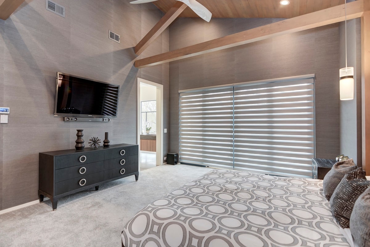 • View Larger Image Modern bedroom with gray textured walls, banded shades, wooden beams, and contemporary furnishings.