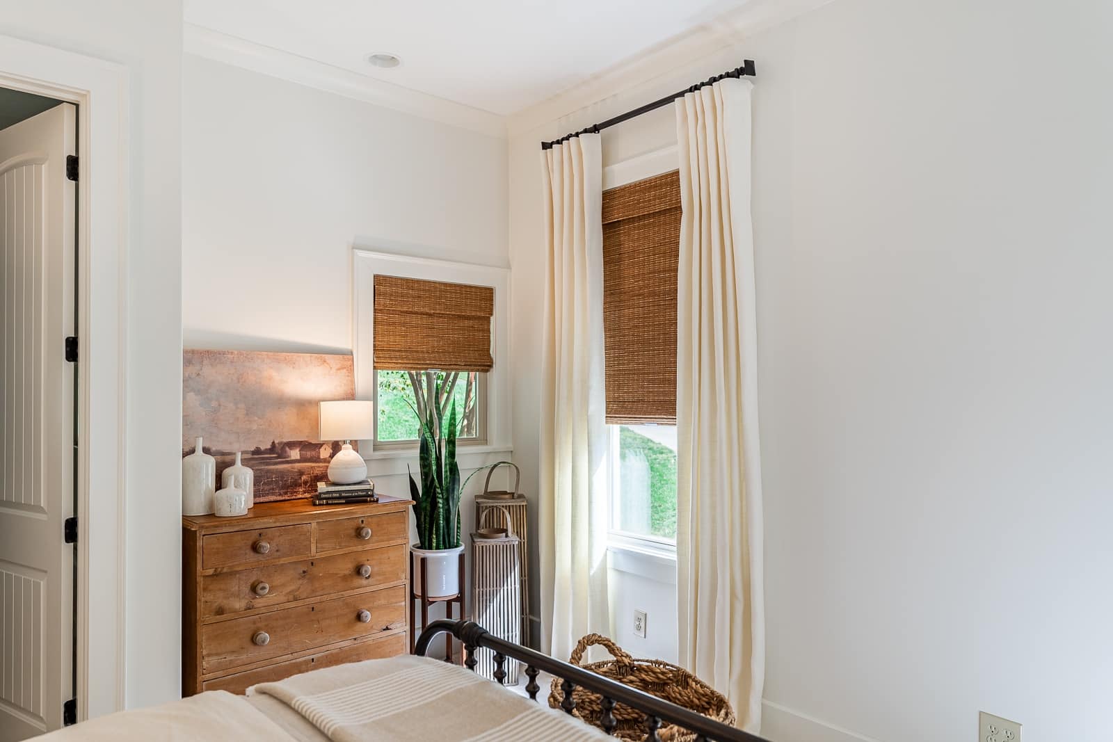• View Larger Image Cozy bedroom corner with wooden dresser, lamp, and woven window shades and soft white drapery